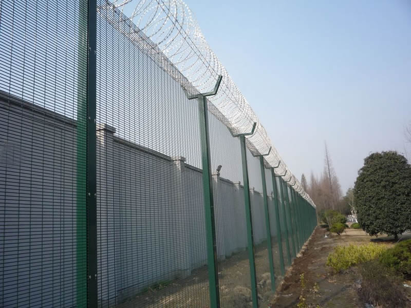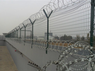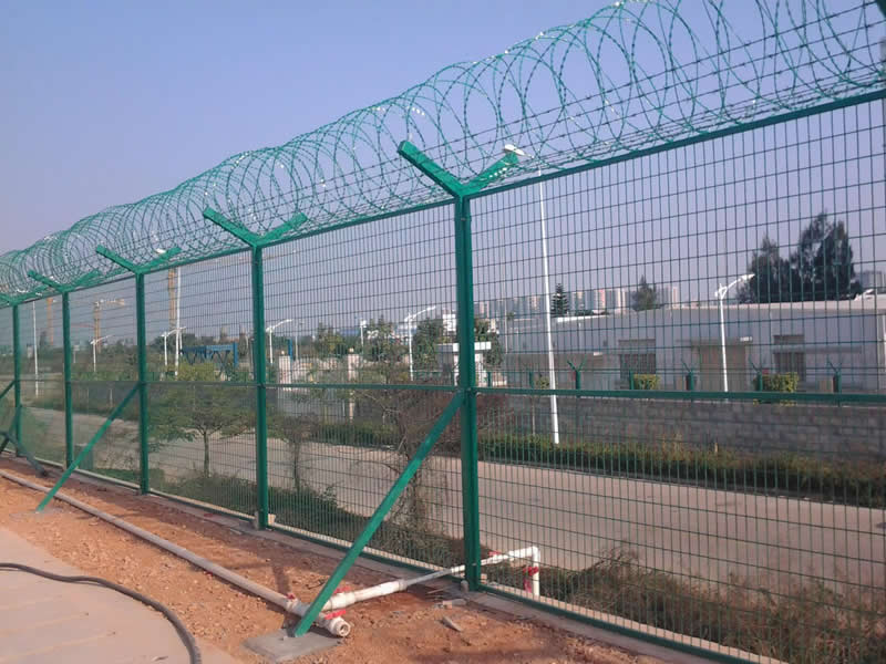 機(jī)場(chǎng)圍欄網(wǎng)又稱作機(jī)場(chǎng)隔離柵、Y型安全防御護(hù)網(wǎng),是由V型支架立柱,加強(qiáng)型焊接片網(wǎng),安全防盜連接件和熱鍍鋅刀片刺網(wǎng)組成強(qiáng)度和安全防御性級(jí)別很高。近年來(lái),被應(yīng)用在機(jī)場(chǎng),軍事基地等高安全場(chǎng)所。